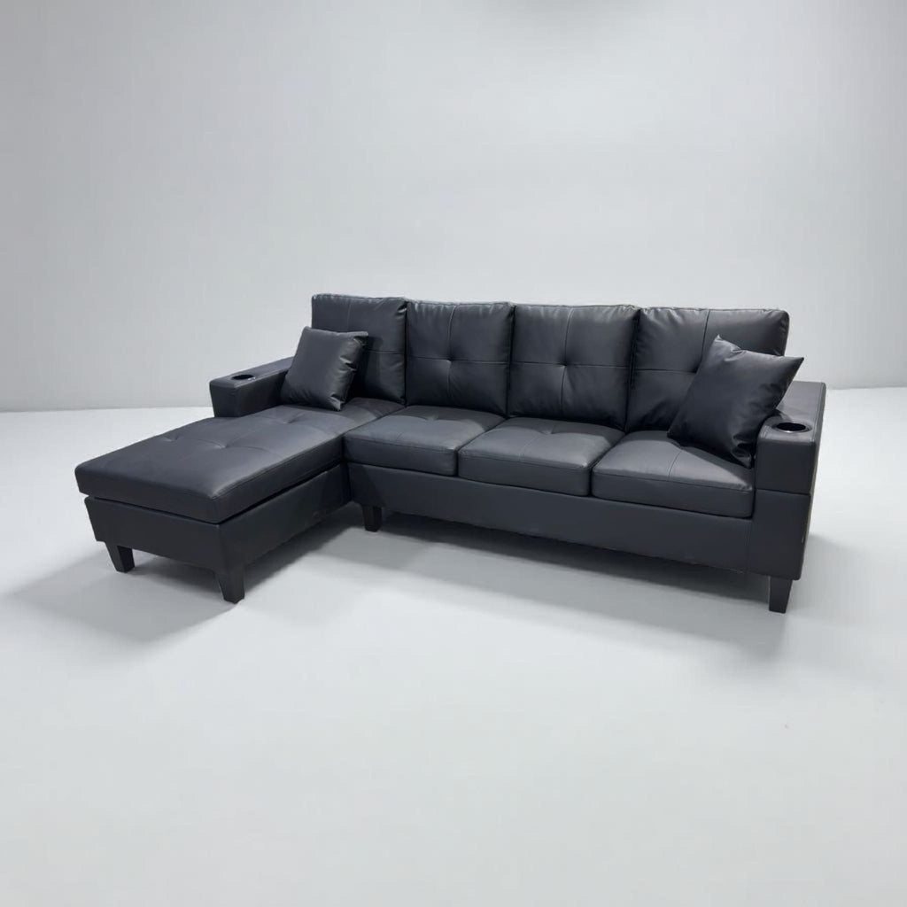 Experience comfort and convenience with our premium reversible chaise sofa, designed to fit your space and your lifestyle. Upholstered in high-quality, durable leather, this piece offers a smooth, luxurious feel and easy maintenance for everyday use. The clever reversible chaise lets you switch the layout to suit your room, while built-in cupholders in the arms provide a perfect spot for drinks, keeping your relaxation time mess-free and enjoyable. Stylish, functional, and made for lounging, this sofa is the perfect centerpiece for any modern living room.