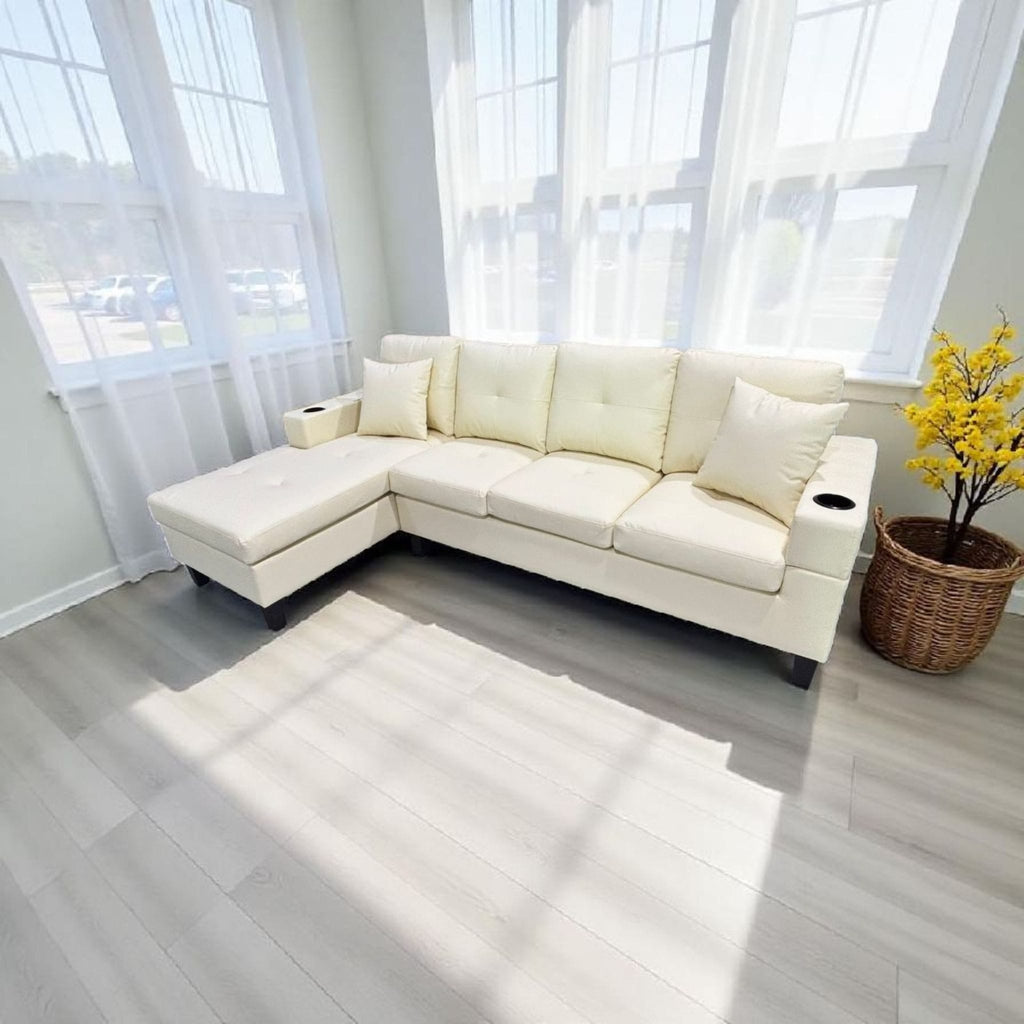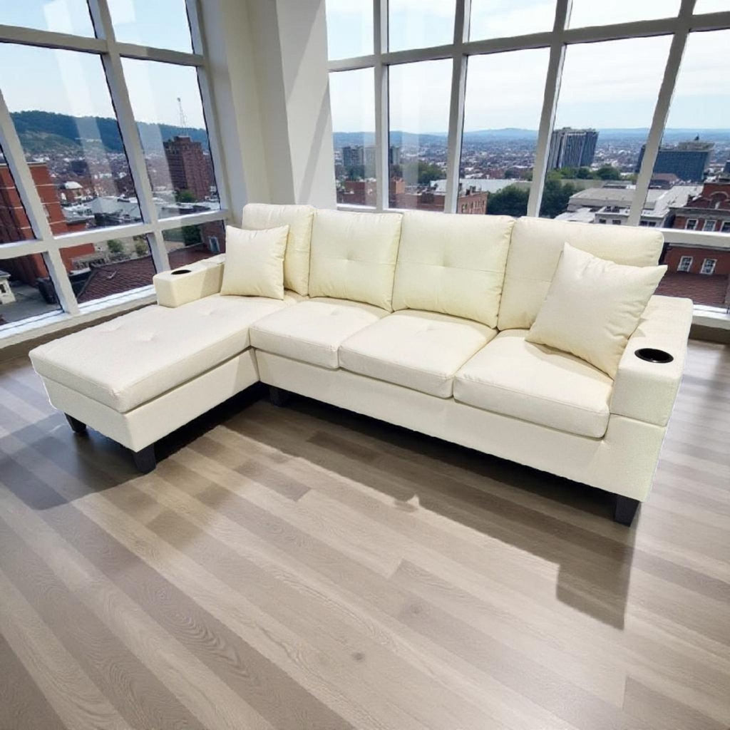 Experience comfort and convenience with our premium reversible chaise sofa, designed to fit your space and your lifestyle. Upholstered in high-quality, durable leather, this piece offers a smooth, luxurious feel and easy maintenance for everyday use. The clever reversible chaise lets you switch the layout to suit your room, while built-in cupholders in the arms provide a perfect spot for drinks, keeping your relaxation time mess-free and enjoyable. Stylish, functional, and made for lounging, this sofa is the perfect centerpiece for any modern living room.