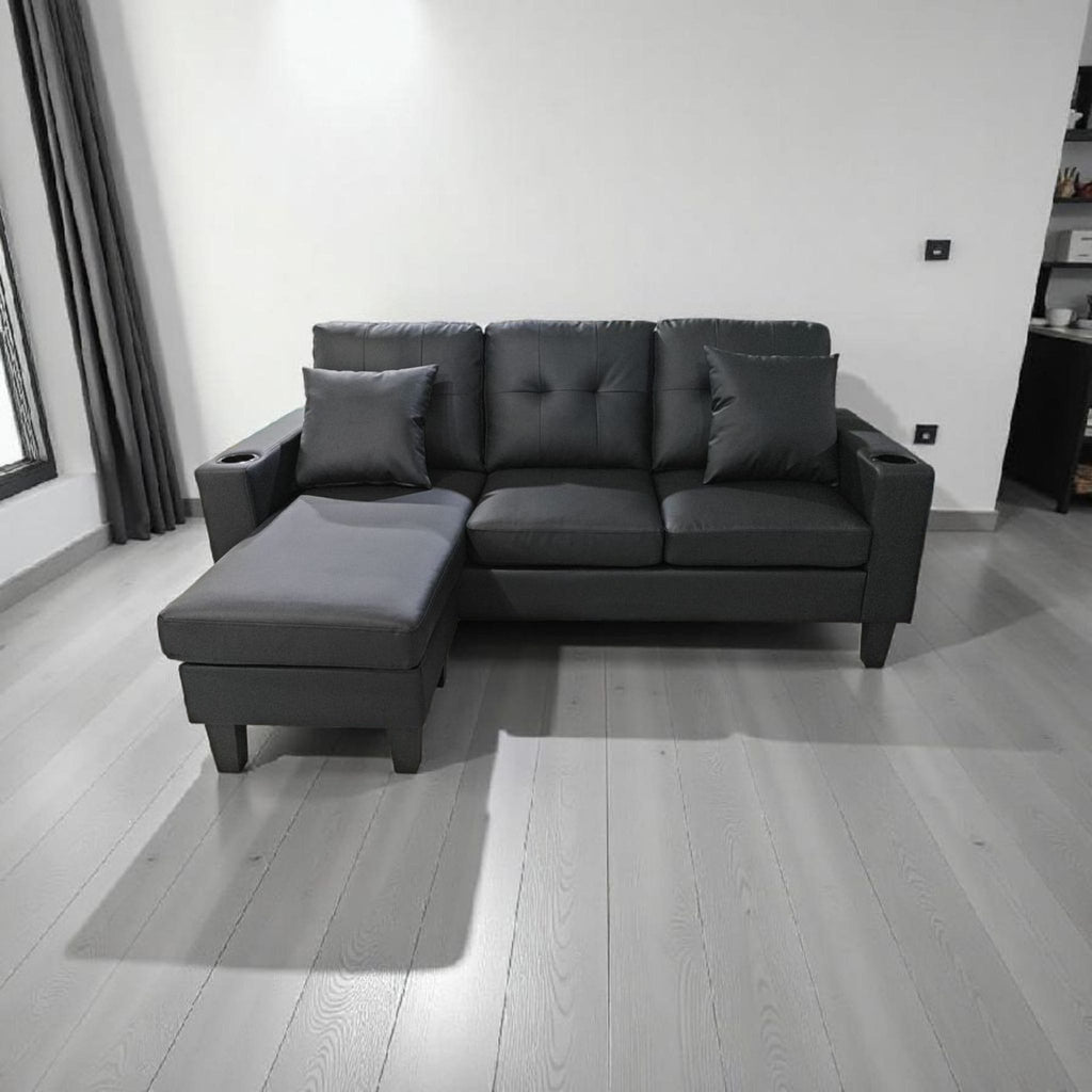 Bring luxury and versatility to your living space with this elegant sectional sofa, featuring a reversible chaise that allows you to easily adapt your layout to fit any room. Upholstered in smooth, high-quality black leather, it offers a sophisticated look with easy-to-clean durability. Designed for both comfort and convenience, the sectional includes built-in cupholders, perfect for keeping beverages close at hand during movie nights or casual lounging. Sleek, functional, and stylish, this sectional adds a touch of modern elegance to any home décor.
