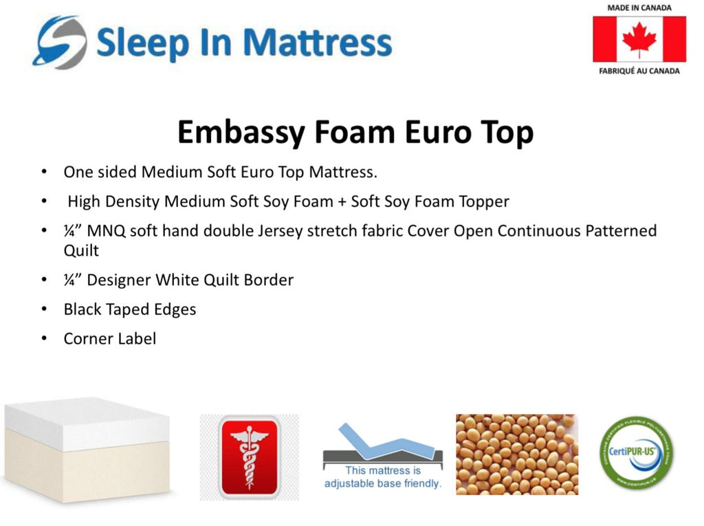 Experience gentle comfort with our One-Sided Medium Soft Euro Top Mattress, crafted for a plush yet supportive sleep. It features a high-density medium soft soy foam core topped with a soft soy foam layer for added cushioning. The mattress is wrapped in a Œ” MNQ soft-hand double jersey stretch fabric cover with an open continuous patterned quilt, offering a breathable, luxurious feel. Enhanced with black taped edges and a Œ” designer white quilted border, this mattress combines style, durability, and comfort for a restful night’s sleep.